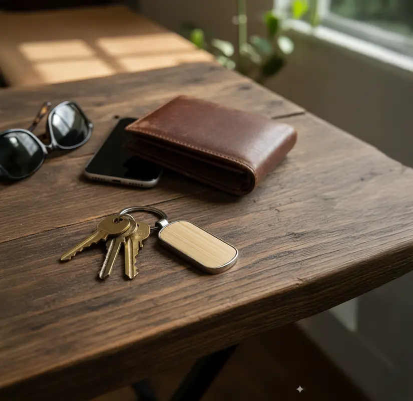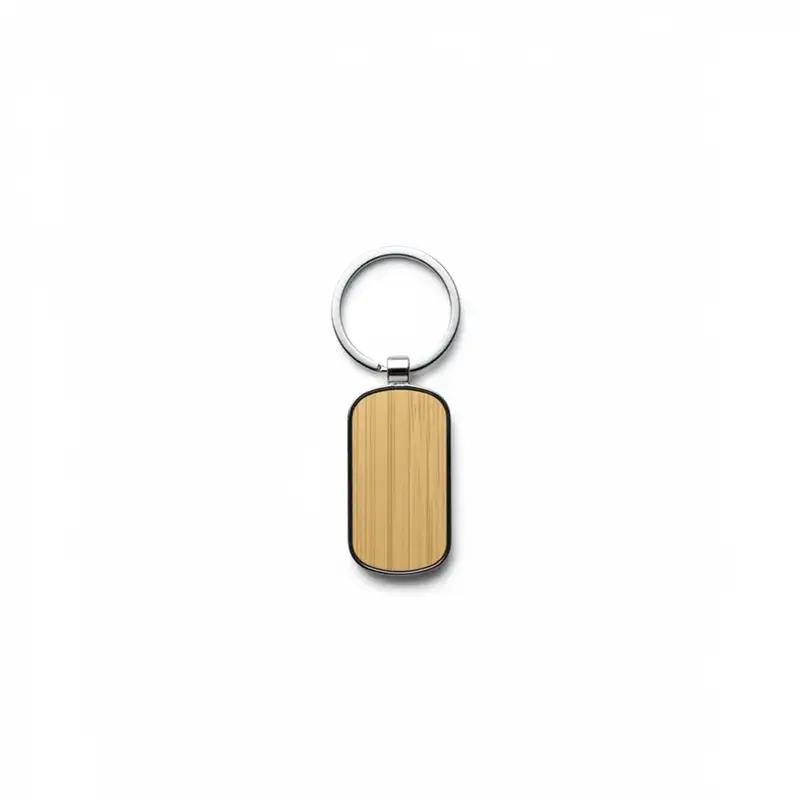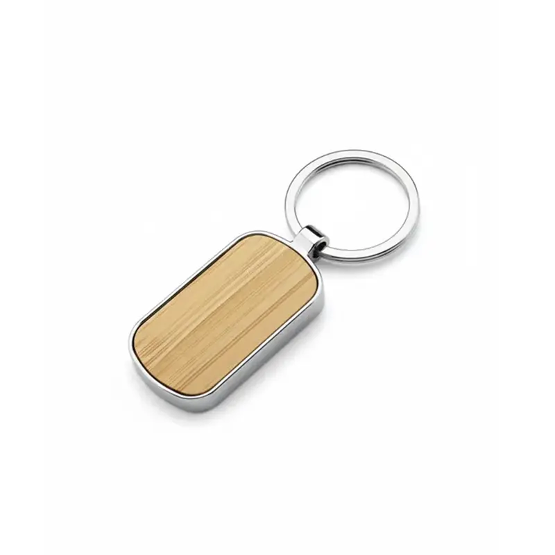 Llavero elegante de forma ovalada hecho de aleación de zinc y bambú natural, fabricado con materiales duraderos y sustentables. Cuenta con un diseño simple y moderno con anilla metálica para llaves, es ideal para el uso diario como accesorio ecológico o como regalo corporativo personalizado.