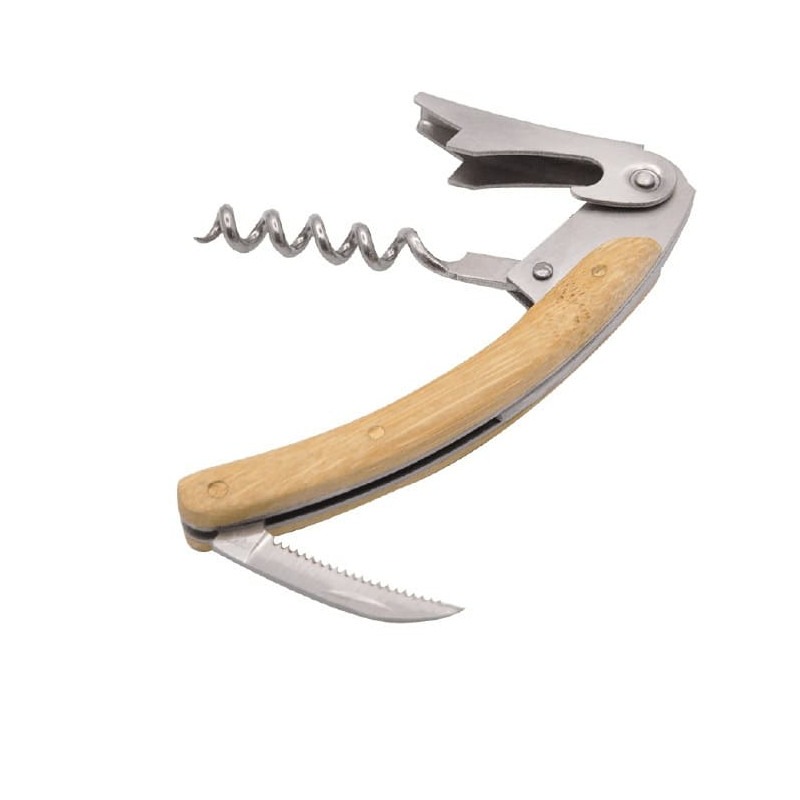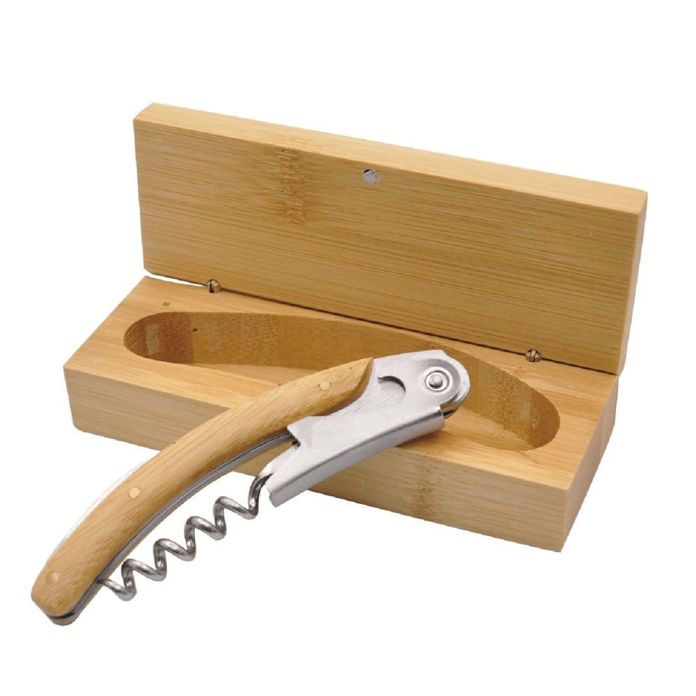 Sacacorchos de primera calidad, con tirabuzón metálico, con caja estuche de madera imantada. Este utensilio multifuncional de acero inoxidable incluye: