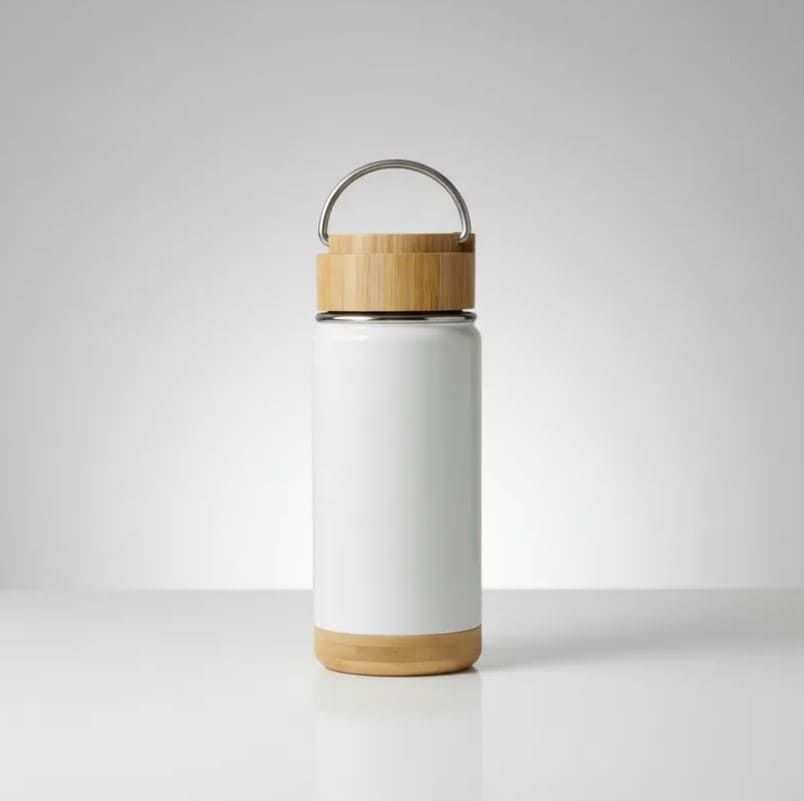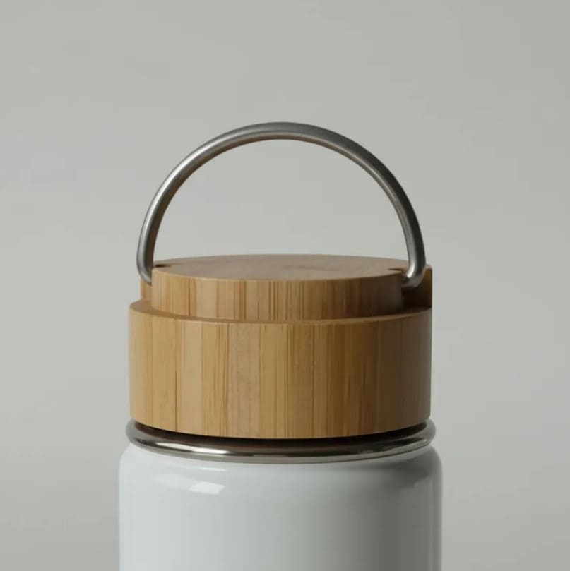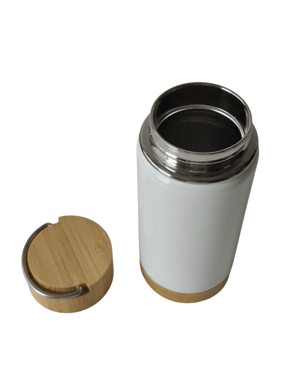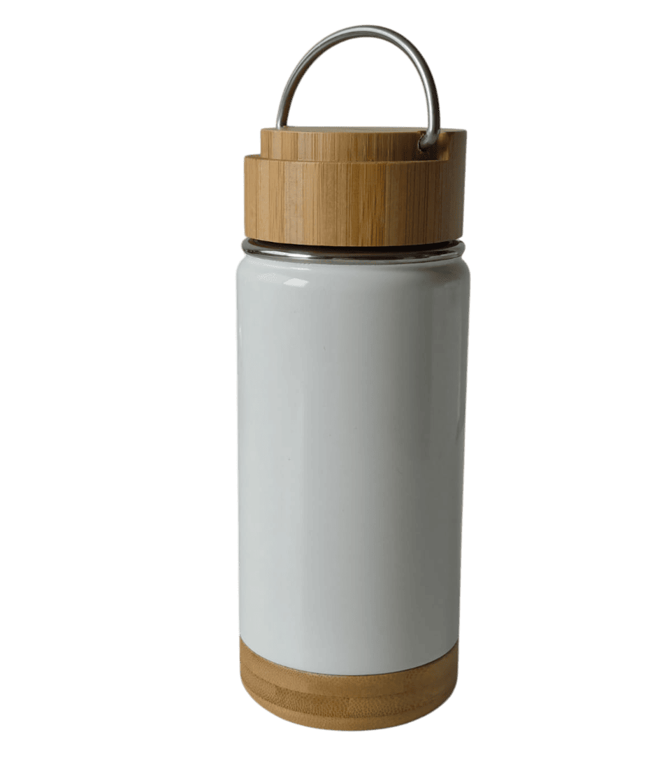 Botella térmica de 350 ml. acero inoxidable. Botella doble pared, sellada al vacío. Interior en acero 304 y exterior en acero 201. Tapa de bamboo a rosca con manija rebatible metálica y base de bamboo. Presentación en caja de cartón blanca.