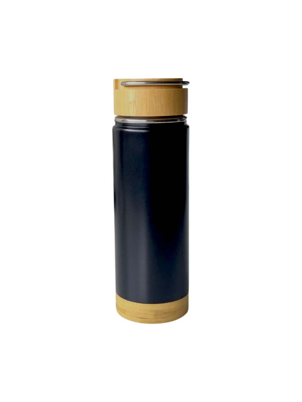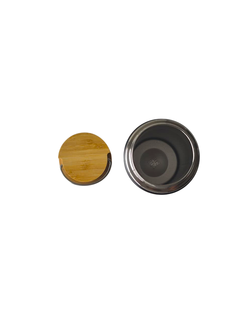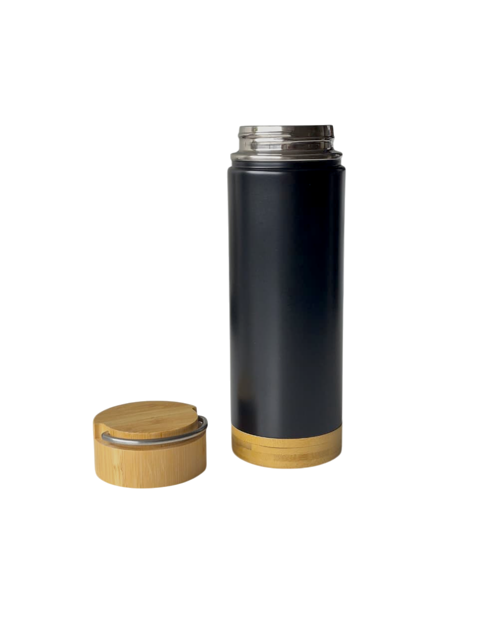 Botella térmica de 350 ml. acero inoxidable. Botella doble pared, sellada al vacío. Interior en acero 304 y exterior en acero 201. Tapa de bamboo a rosca con manija rebatible metálica y base de bamboo. Presentación en caja de cartón blanca.