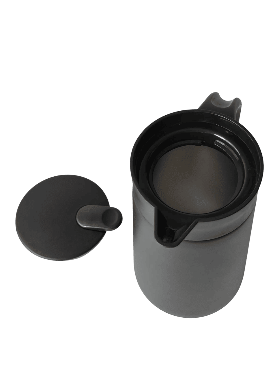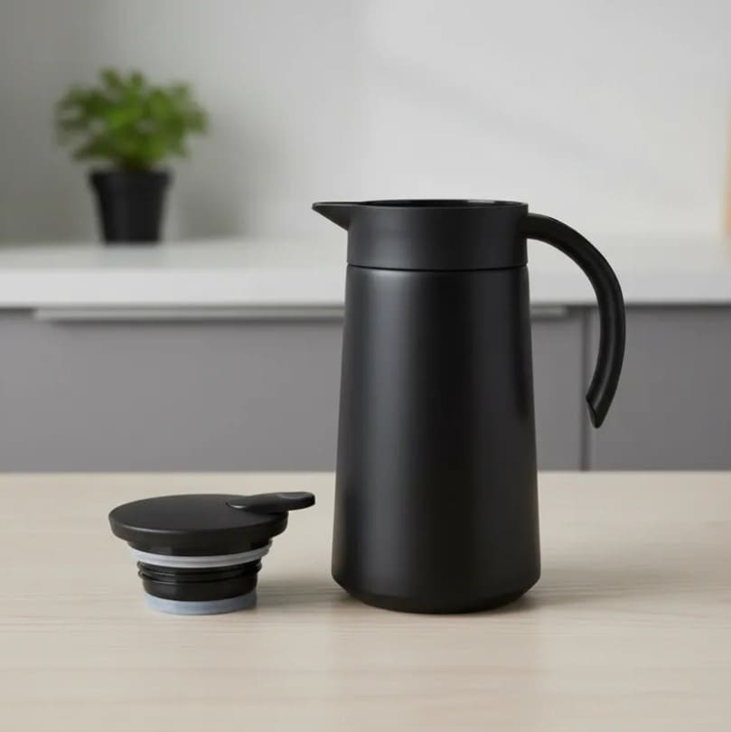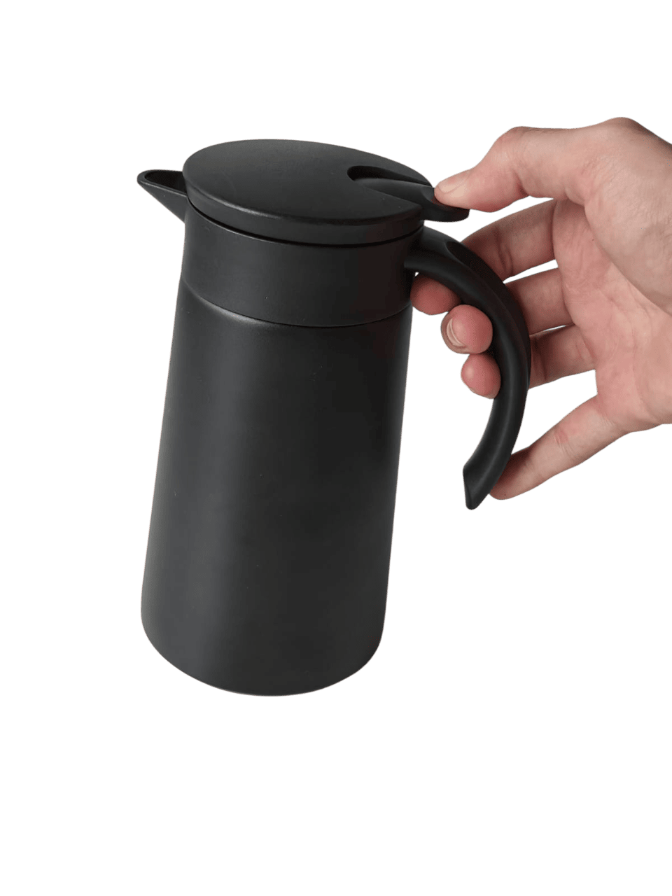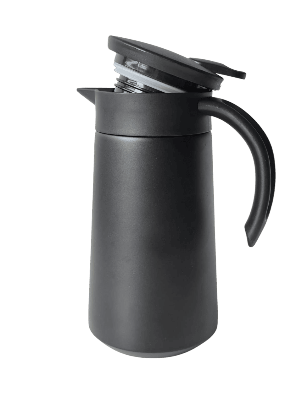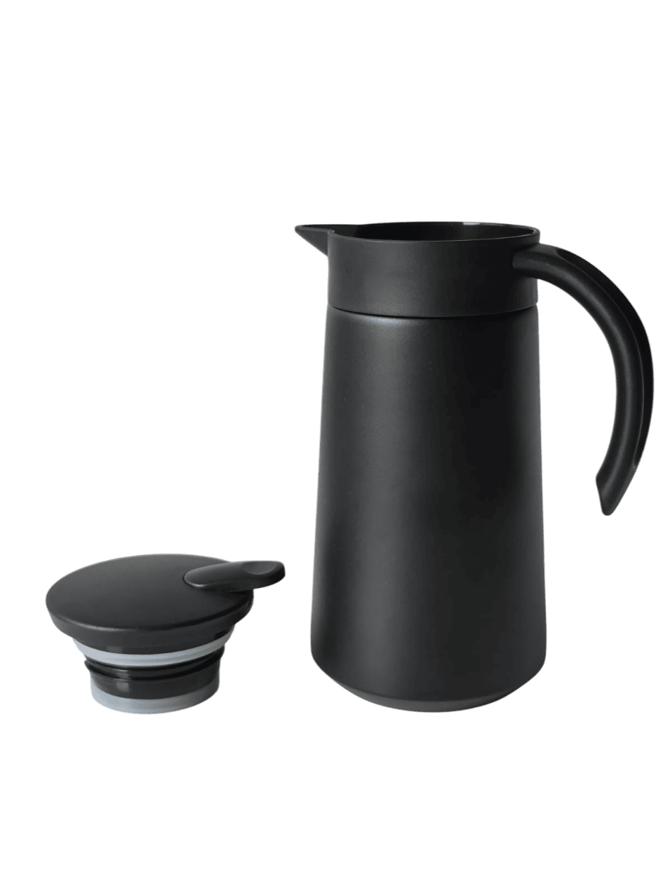 Jarra térmica de 800ml pared doble de acero. Mantiene hasta 12 horas de agua caliente o 24 horas de agua fría. Tapa hermética anti-derrames con botón pulsador. Ideal para trasladar. Base con goma anti deslizante. Diseño moderno y elegante en negro mate. Caja contenedora de cartón blanco.