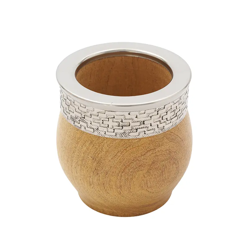 Mate de algarrobo seleccionado pulido con virola imperial de acero inoxidable guarda pampa. Cada pieza puede presentar vetas y nudos que le otorgan un carácter único. Es ideal para quienes desean un mate resistente, elegante y cómodo para el uso diario o para regalar.