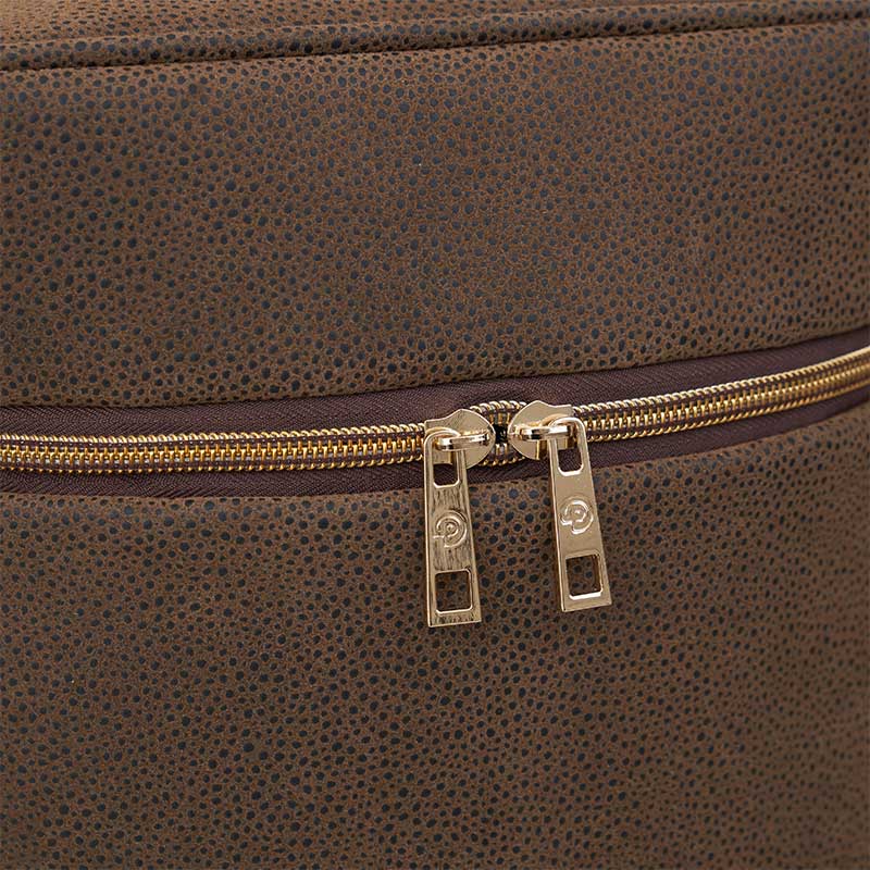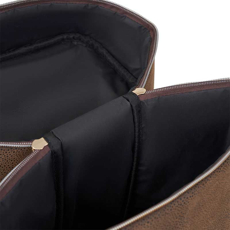 Bolso para equipo de mate Pampero, realizado en simil carpincho, forrada internamente en negro. Cuenta con correa regulable. La foto es ilustrativa, no incluye termo ni mate. Medidas: 39 x 23 x 14 cm. Capacidad: 12lts.