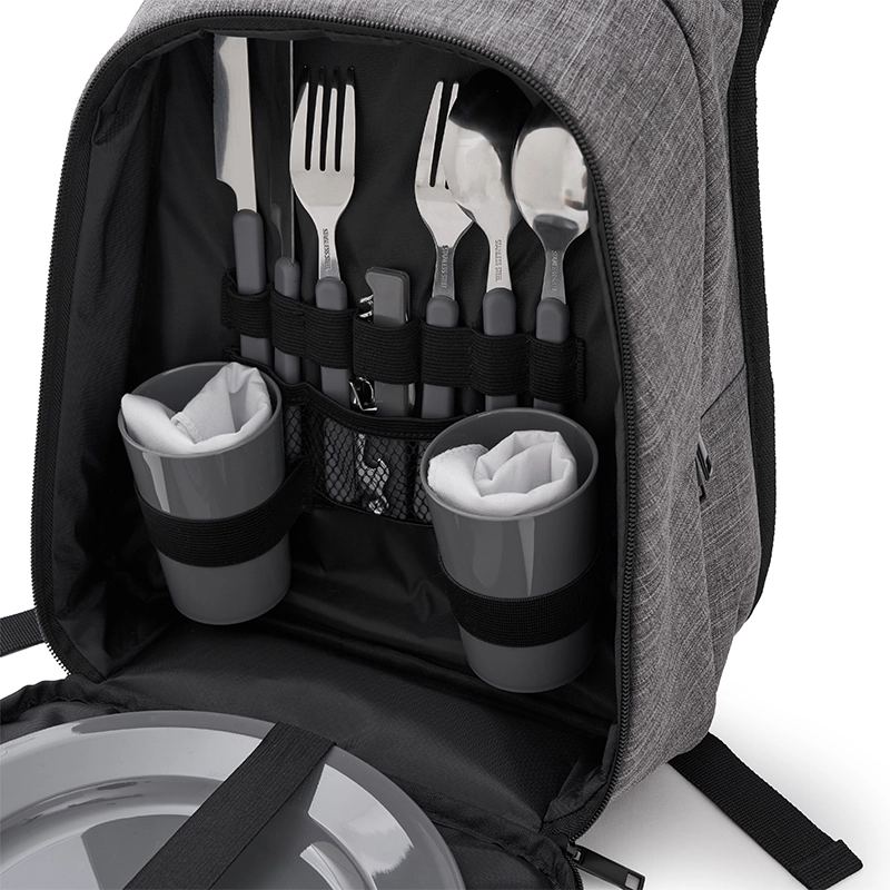 Mochila funcional y moderna para llevar alimentos y bebidas. Fabricada con polycanvas y revestimiento interior térmico de PEVA. Cuenta con compartimento principal amplio para alimentos, compartimento secundario para utensilios o accesorios y correas acolchadas ajustables. Incluye un completo set de picnic con platos, vasos, cubiertos y sacacorcho, todo en el mismo tono. Ideal para picnics, salidas al aire libre, días de campo o viajes, manteniendo todo organizado y fresco.