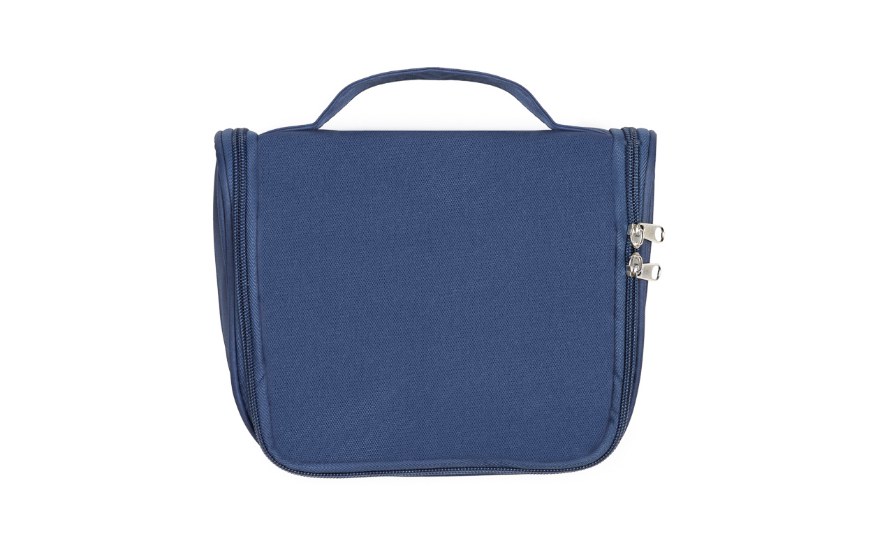 Necessaire de microfibra con compartimento principal, bolsillo de red y gancho para colgar. Cierre de apertura completa. Ideal para viajes.