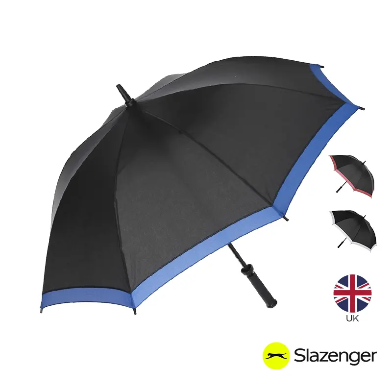 Realizado en Pongee 190T con 8 gajos. Estructura realizada en fibra de vidrio con apertura automática. Sistema Windproof con resorte para evitar que fuertes vientos lo dañen. Incluye funda. Medidas: Largo 81 cm x diámetro 102 cm. Slazenger.