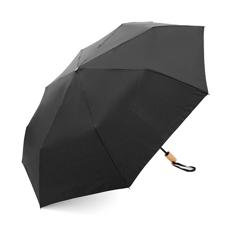 Paraguas practico con funda. El paraguas Rainy esta fabricado con paneles de RPET Pongee 190T fabric, con costillas de metal y fibra de vidrio. Su agarre esta diseñado para que sea cómodo y elegante con un agarre de madera. Cuenta con una funda propia y una cinta de agarre en el mango. Ideal para tener a mano en días lluviosos ya que es pequeño y fácil de llevar.