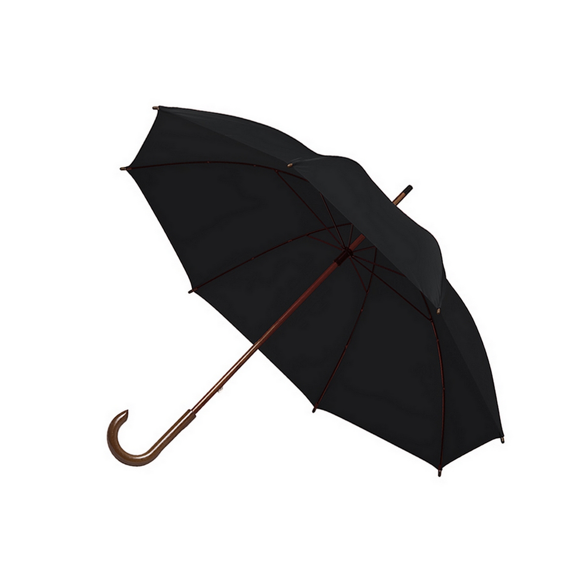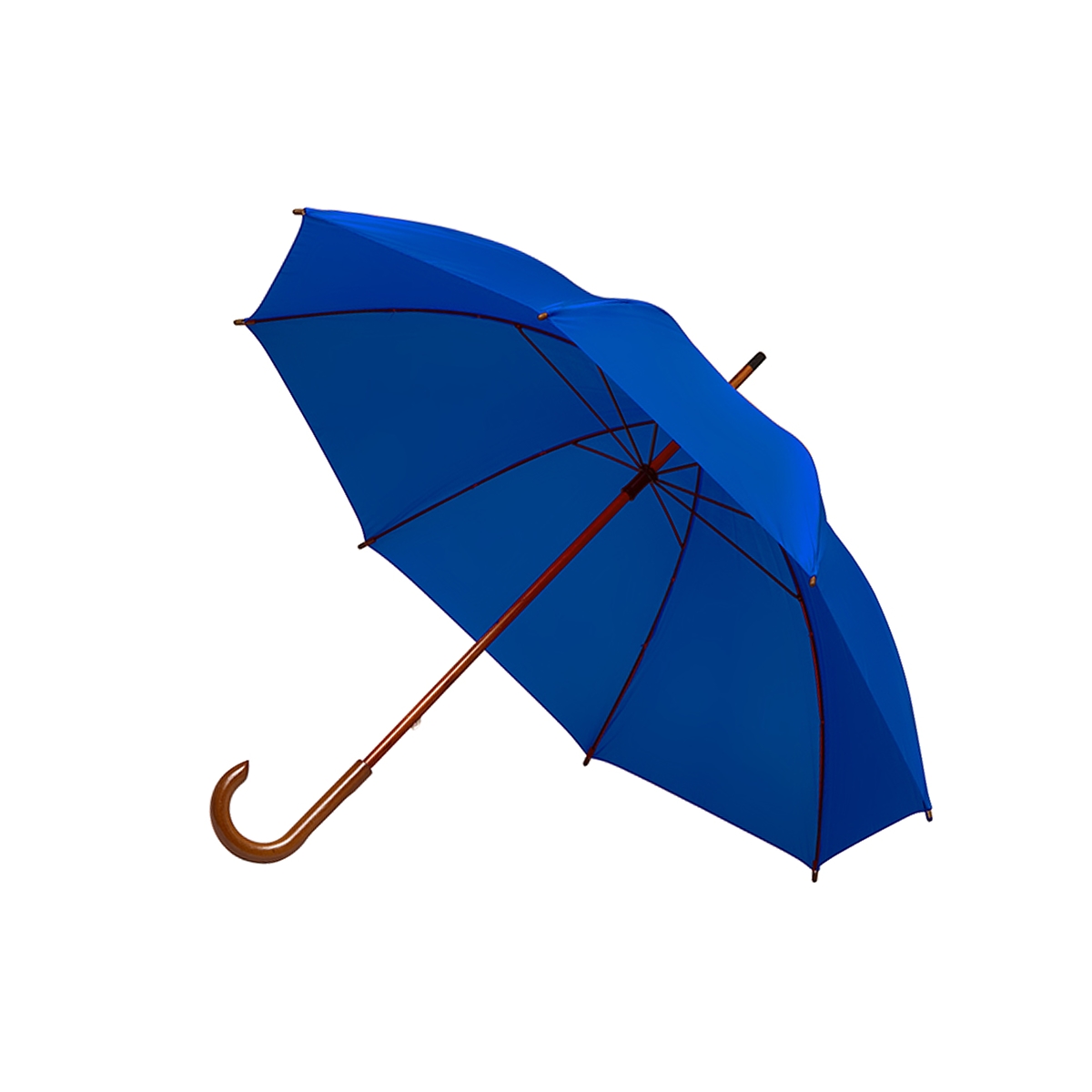 Paraguas de 8 gajos con mango de madera curvo. Sector plano en el mango para personalizar. Elaborado en Polyester. Medidas: Largo 89 cm x diámetro 100 cm. Material: Polyester 190T. Tahg.