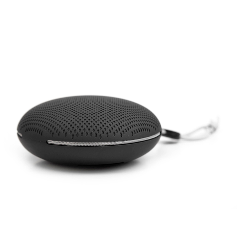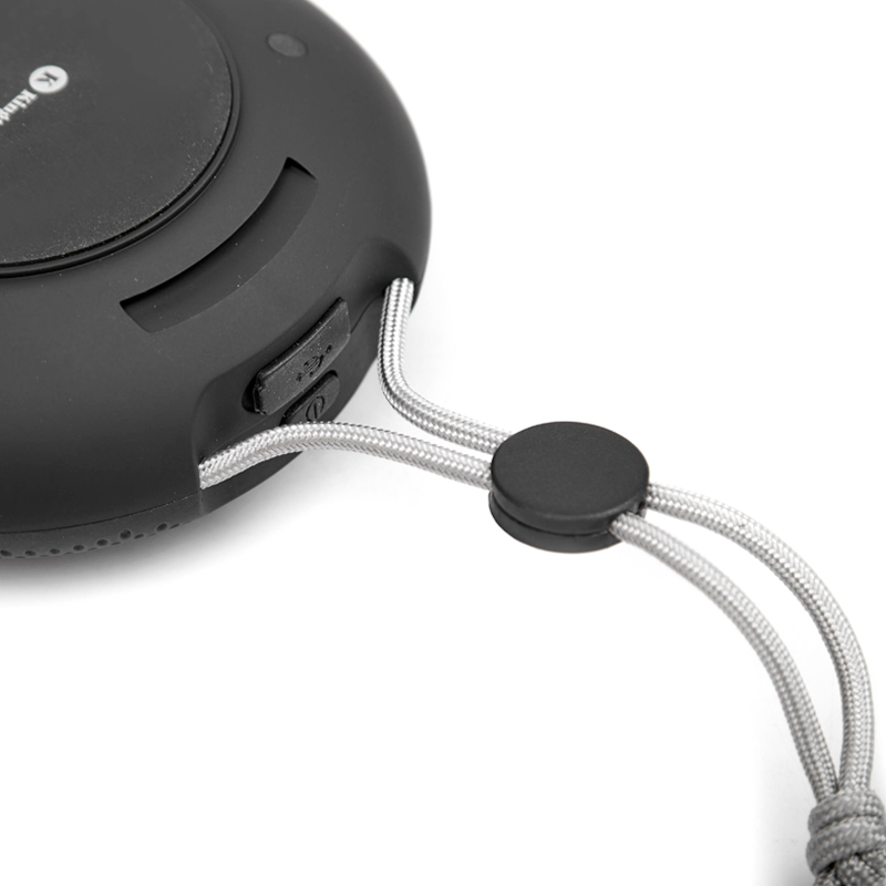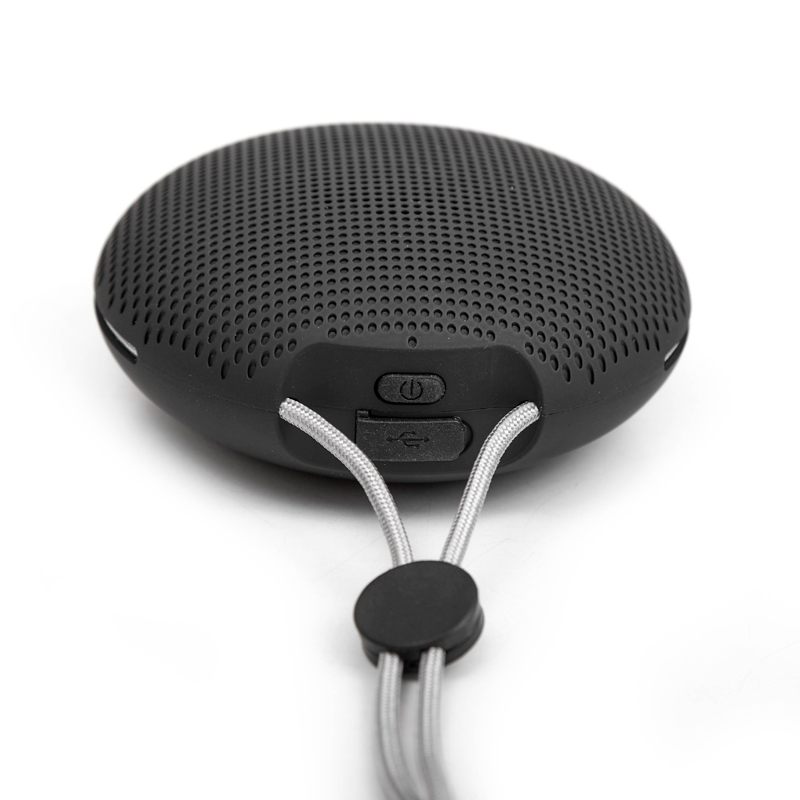 Parlante circular portátil con tecnología bluetooth y micrófono manos libres. Realizado en ABS, con correa para colgarlo y facilitar su transporte.