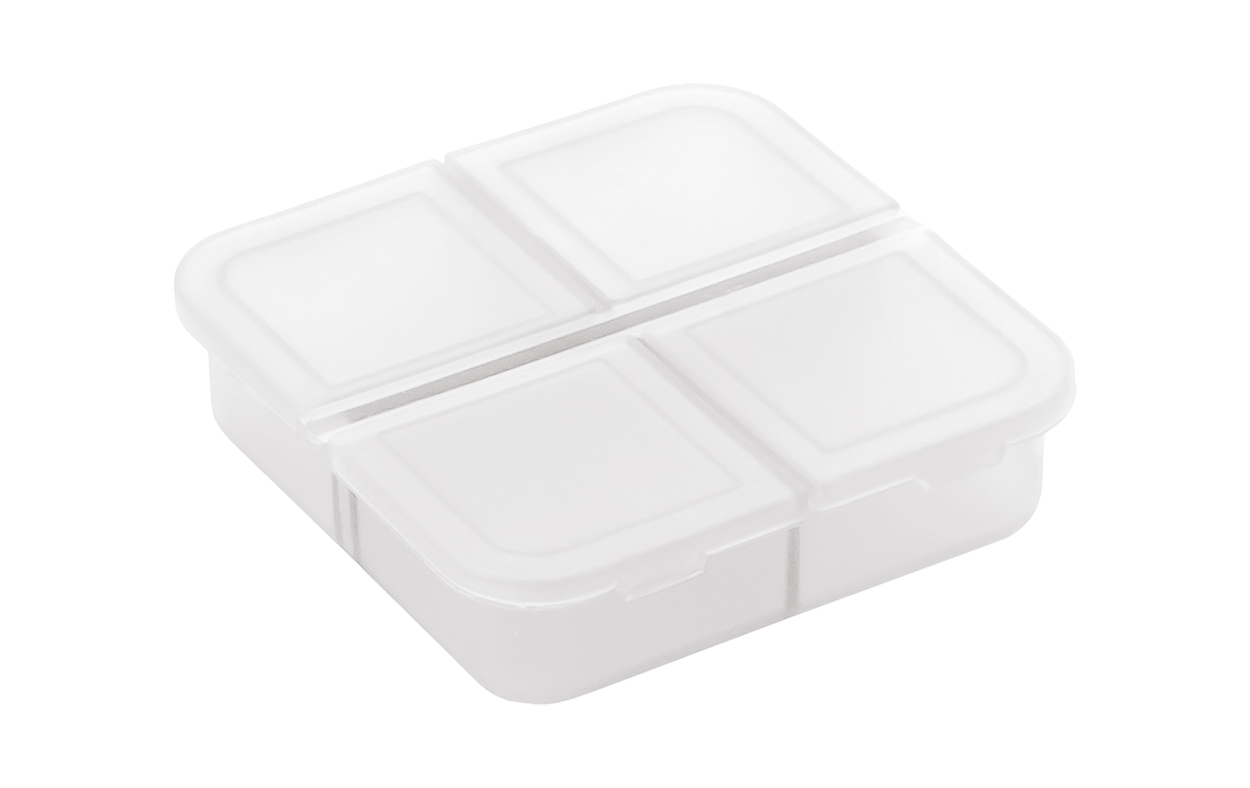 Pastillero con tapa. Contiene cuatro divisiones. Medidas: 6 x 6 x 1,8 cm.