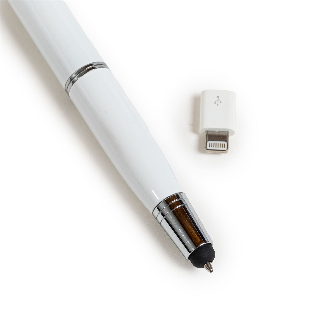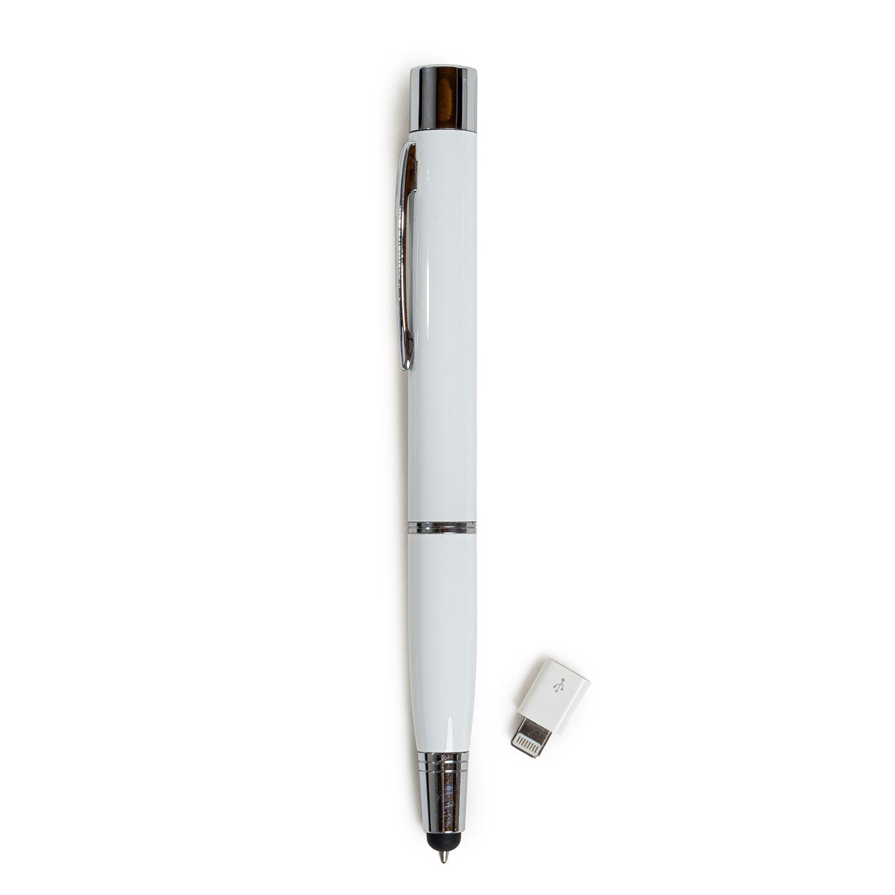 Descripción: Bolígrafo metálico con power bank integrado y touch. Puntera: Apertura del bolígrafo medio giro desde el touch. Cuerpo central Power Bank: Desenroscando el cuerpo aparece el conector para celular tipo B micro USB para la utilización de la carga (1000 mAh), provee un adaptador para I phone 5 y 6, y otro para la línea S8 y S9. Removiendo un capuchón detrás del clip posee una ficha USB para su carga.