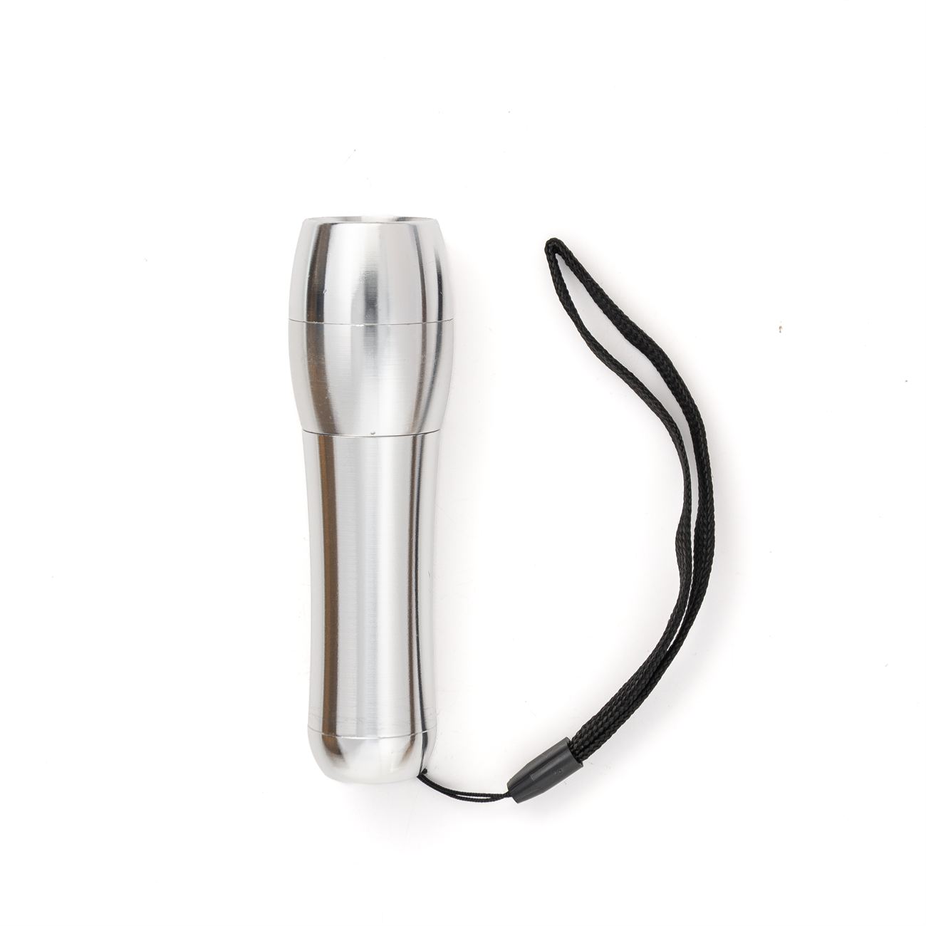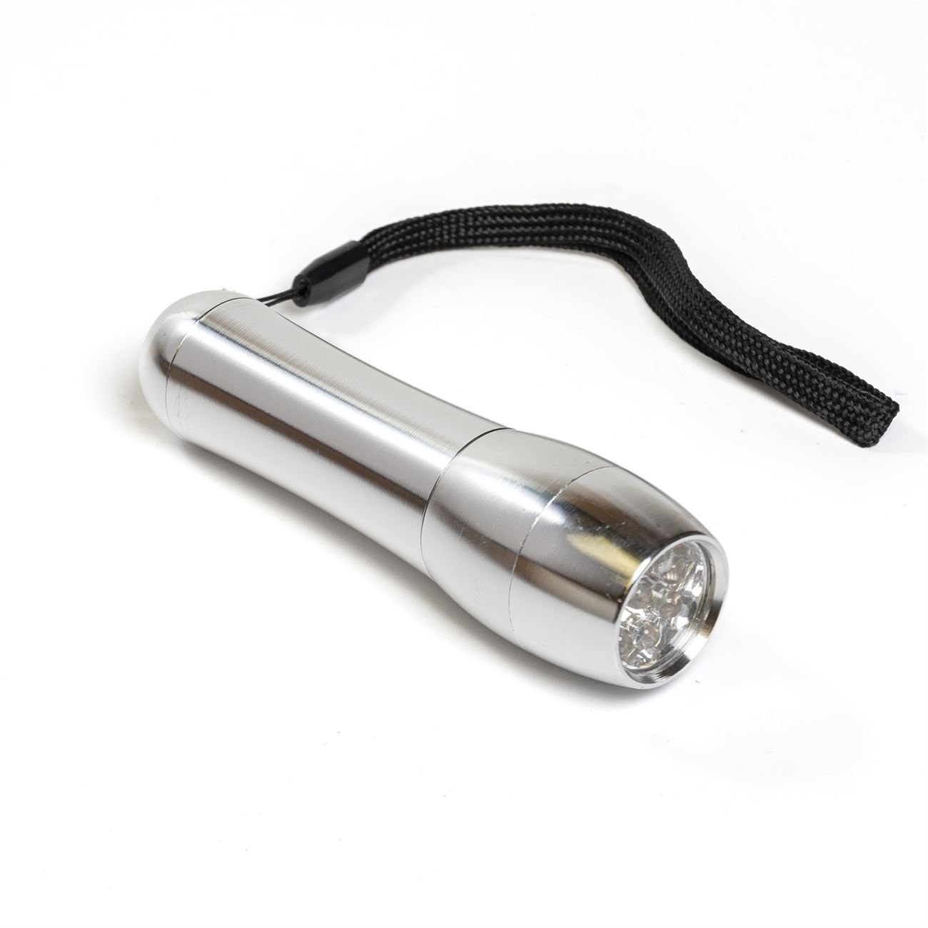 Descripción: Linterna metálica de nueve leds. Botón de encendido en la parte posterior. Cordón sujetador. Requiere tres pilas AAA