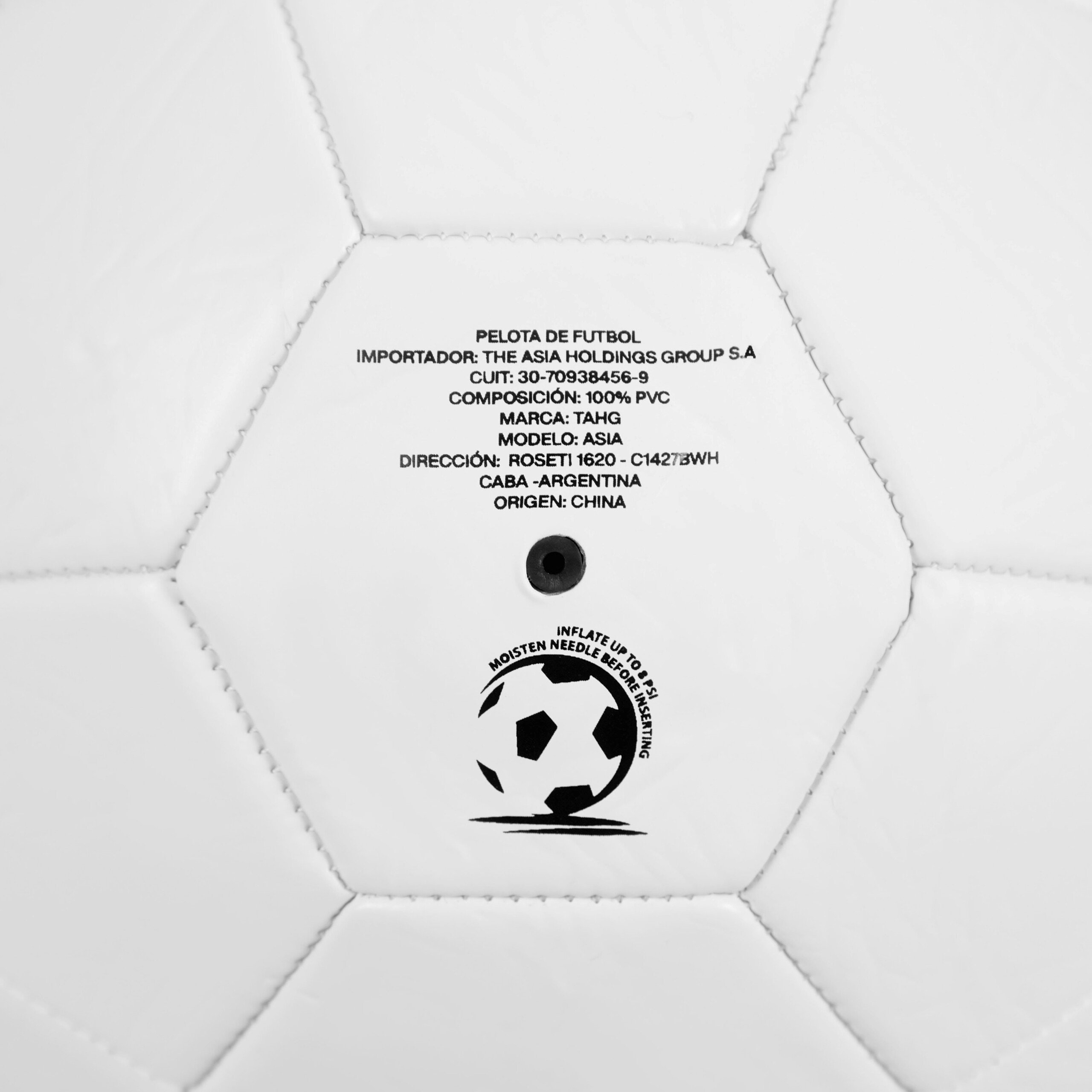 Pelota de fútbol número 5 de PVC con terminación mate de 30 gajos. Espesor de 2,5 mm. Peso: 400 grs (5% tolerancia).