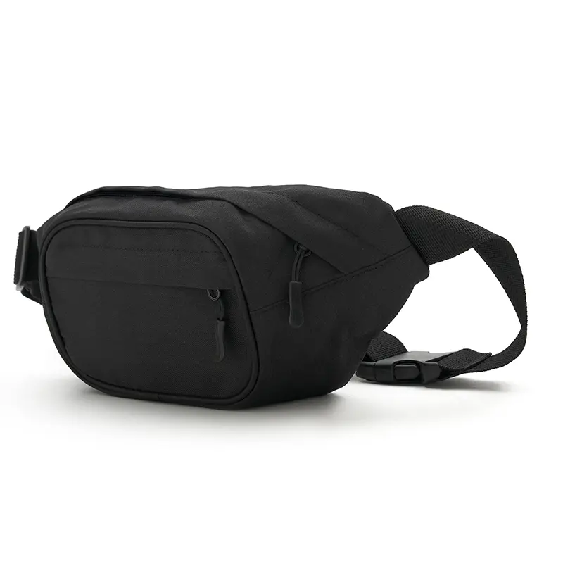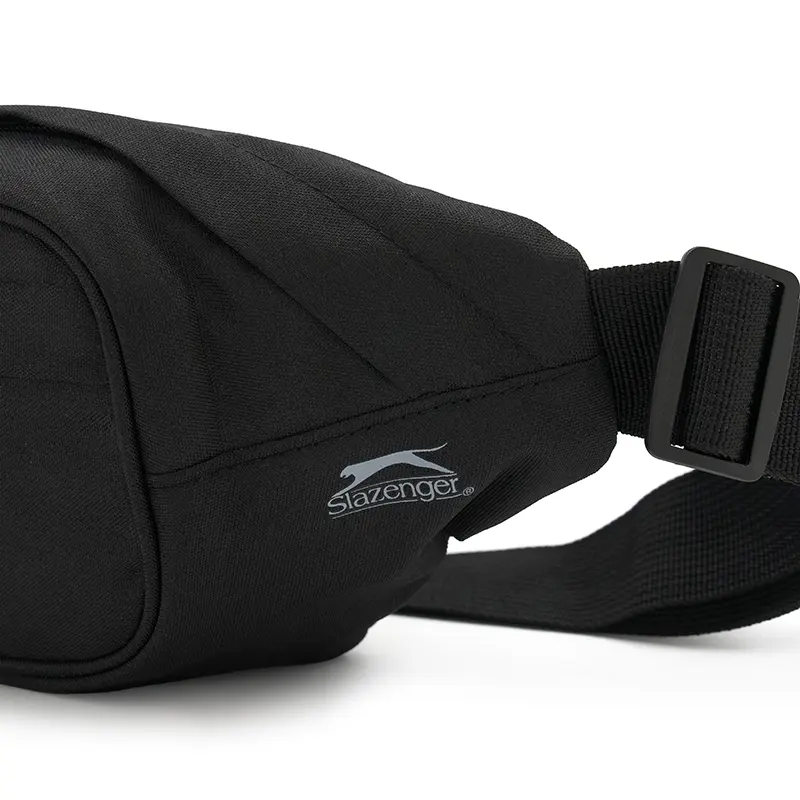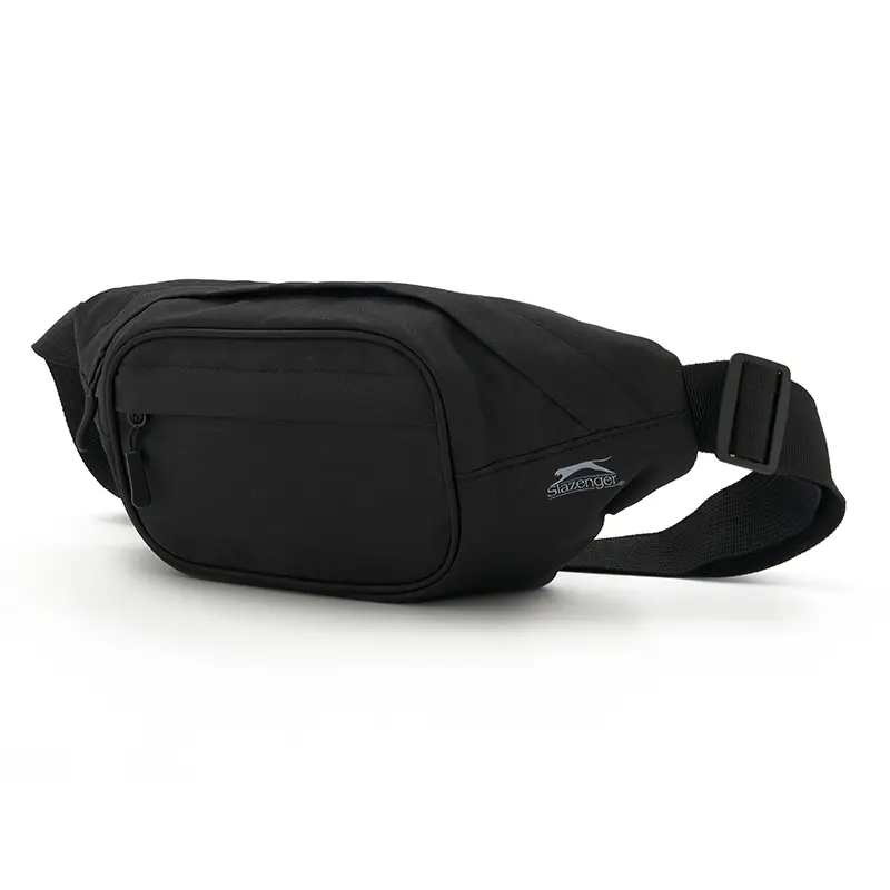 Riñonera de color negro, fabricada con un exterior de 600DPU y forro completo de 210D. Cuenta con un bolsillo frontal con cierre y tirador elástico, y una correa ajustable de 4 cm de ancho con hebilla plástica. Medidas: 34 x 14 x 5 cm. Ideal para quienes buscan una opción práctica y cómoda para llevar lo esencial en sus actividades diarias o al aire libre. Slazenger.