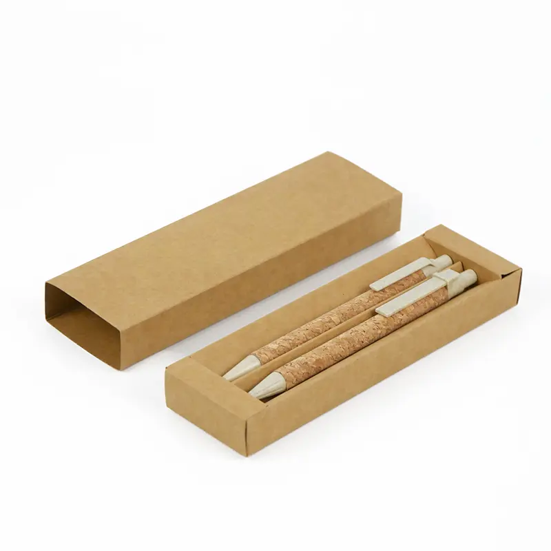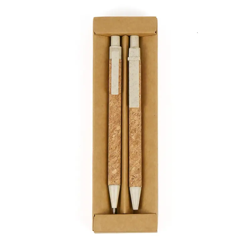 El Set Ancor incluye bolígrafo y lápiz con cuerpo de corcho y piezas de Wheat Straw, pasta de tallo de trigo, un material sustentable que reduce el consumo de plásticos vírgenes. Viene presentado en una práctica caja de cartón.