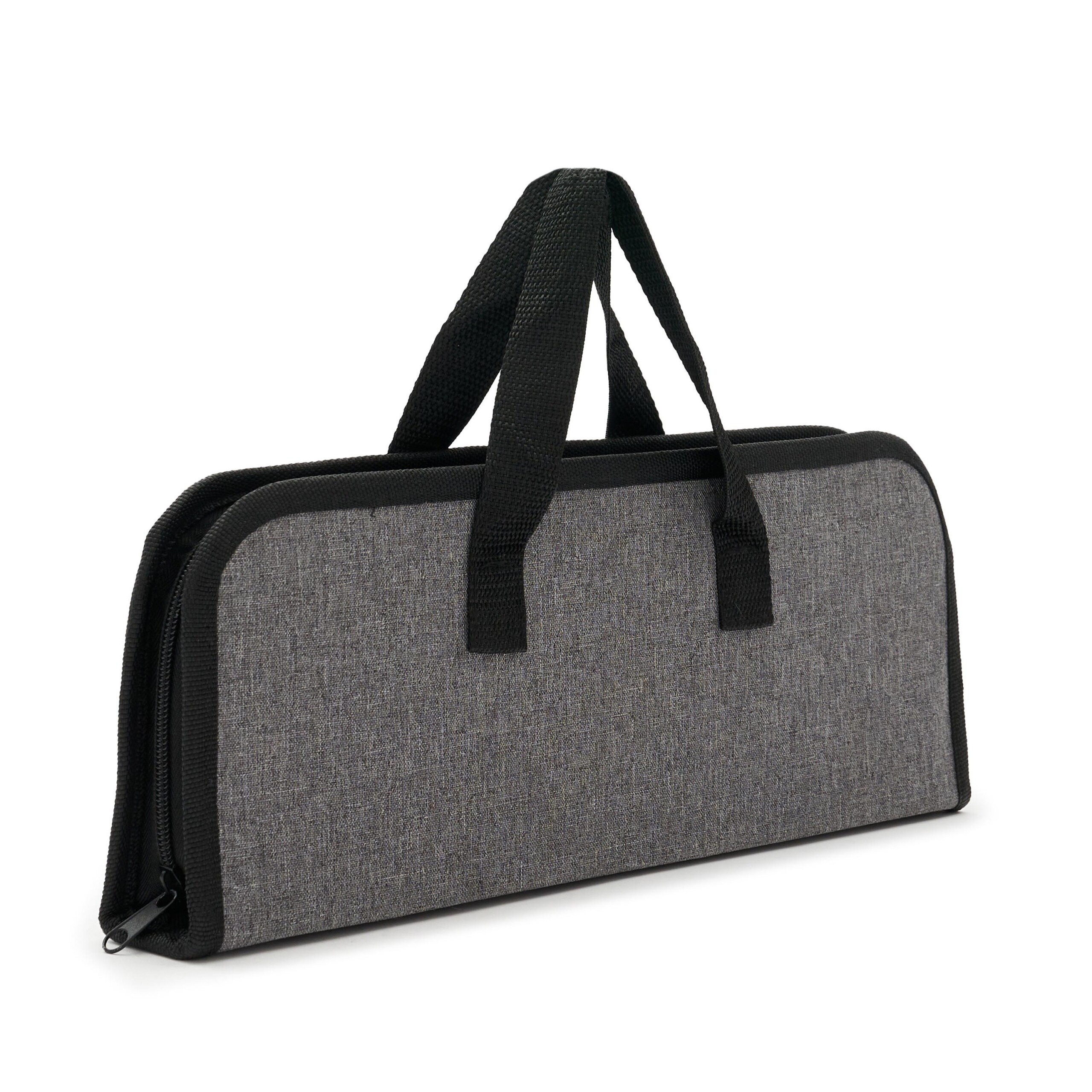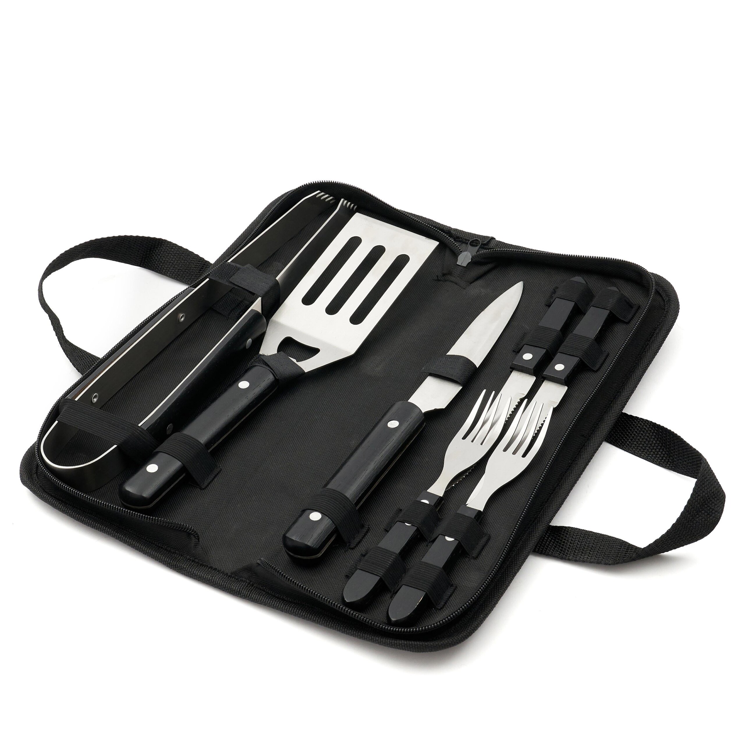 Set de asado con estuche de polyester y nylon color gris. Contiene: 2 juegos de cuchillo y tenedor, 1 pinza, 1 cuchillo asador y 1 espátula. Todas las piezas cuentan con mango de madera. Producto aprobado por el INAL para el contacto con alimentos. Tahg.