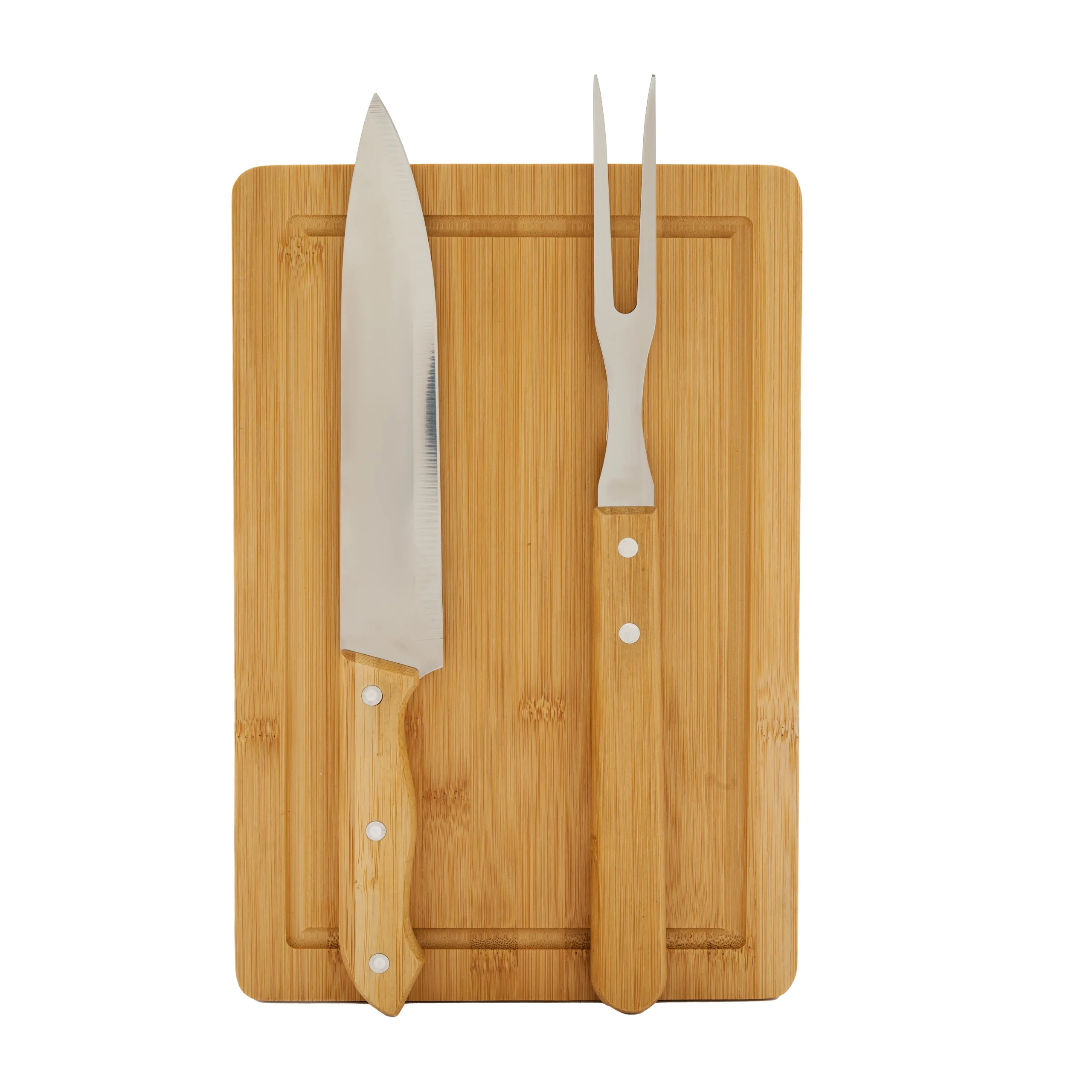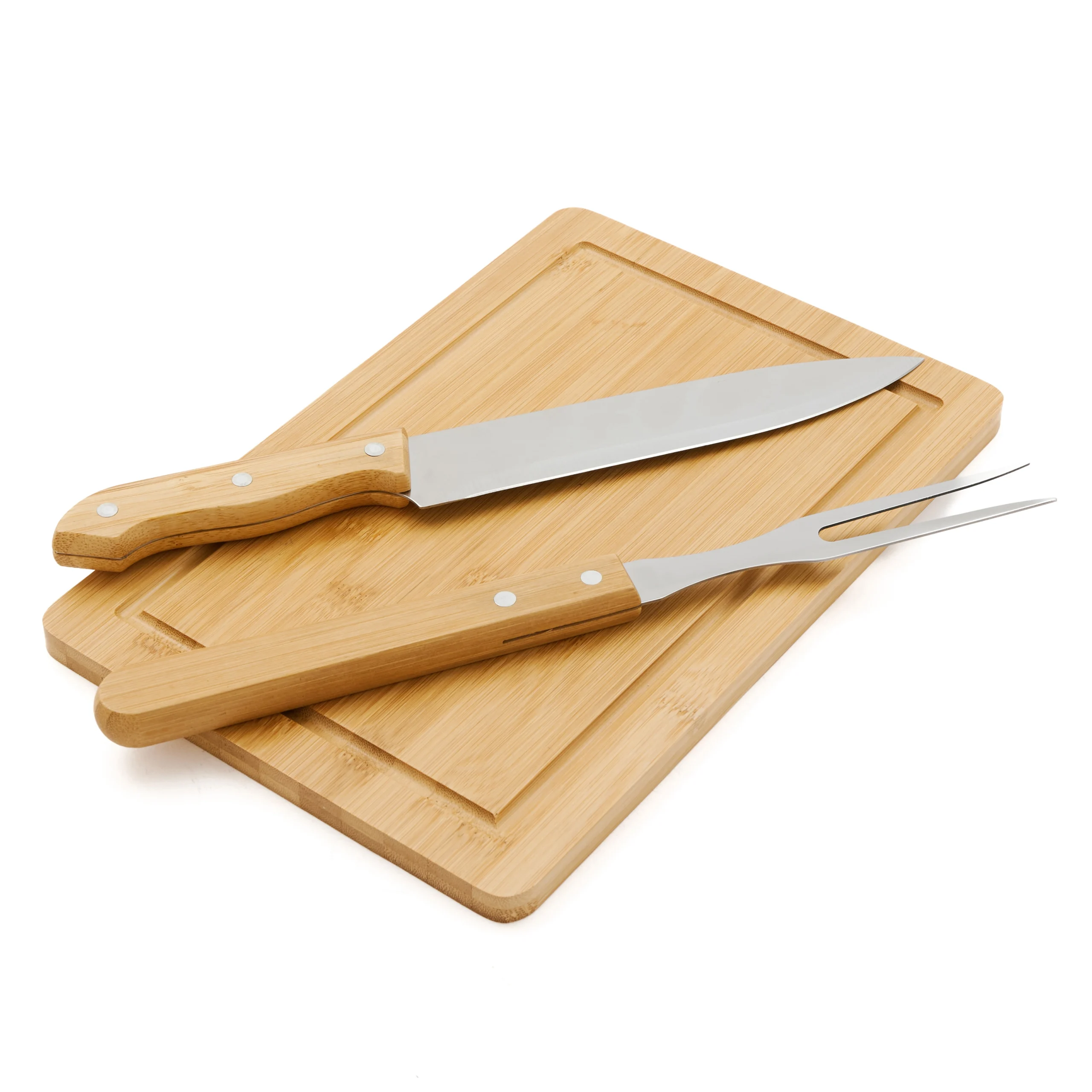 El set de asado Roti contiene: tenedor y cuchillo de 33 cm, ambos con mango de madera y, tabla de bamboo de 30 x 20 x 1,2 cm. Este set incluye todo lo que necesitas, ideal para los amantes del asado.