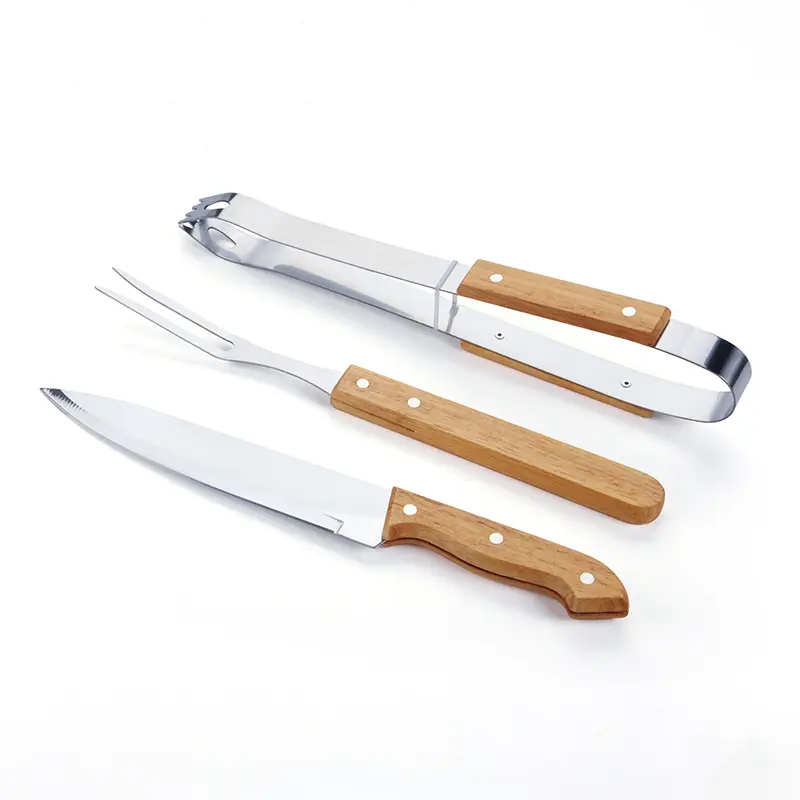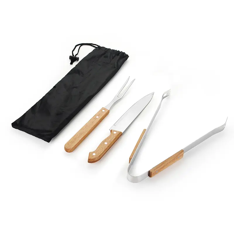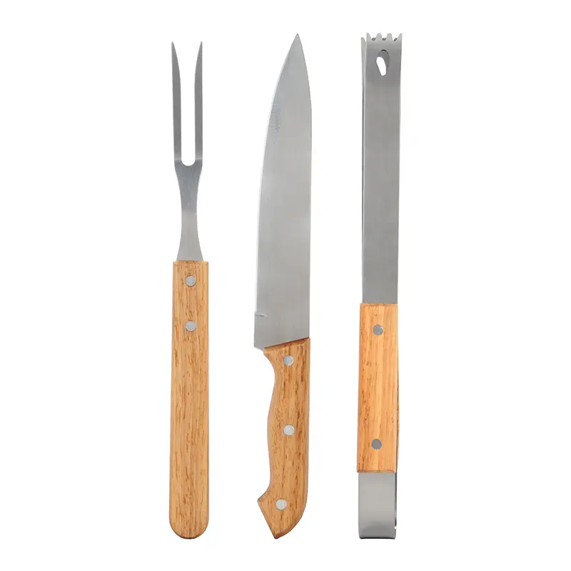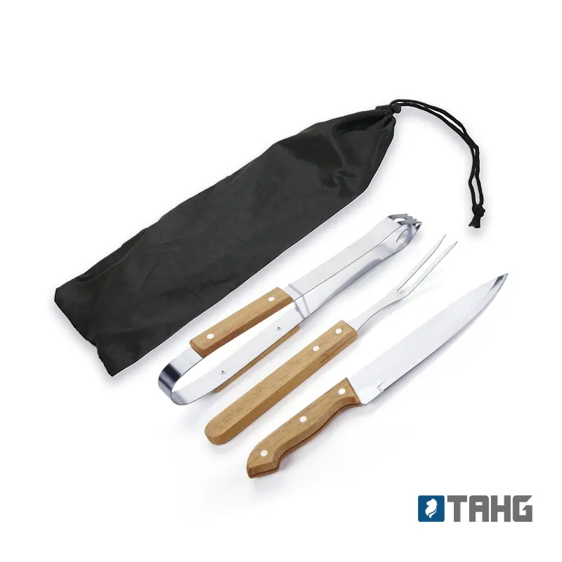 Set de asado con cuchillo, tenedor y pinza. Fabricado en madera de hevea y acero inoxidable 420. Contiene cuchillo, tenedor trinchador , pinza para asado y bolsa de guardado de nylon. Es ideal para manipular cortes de carne con precisión y comodidad durante la parrilla o asados al aire libre. Tahg.