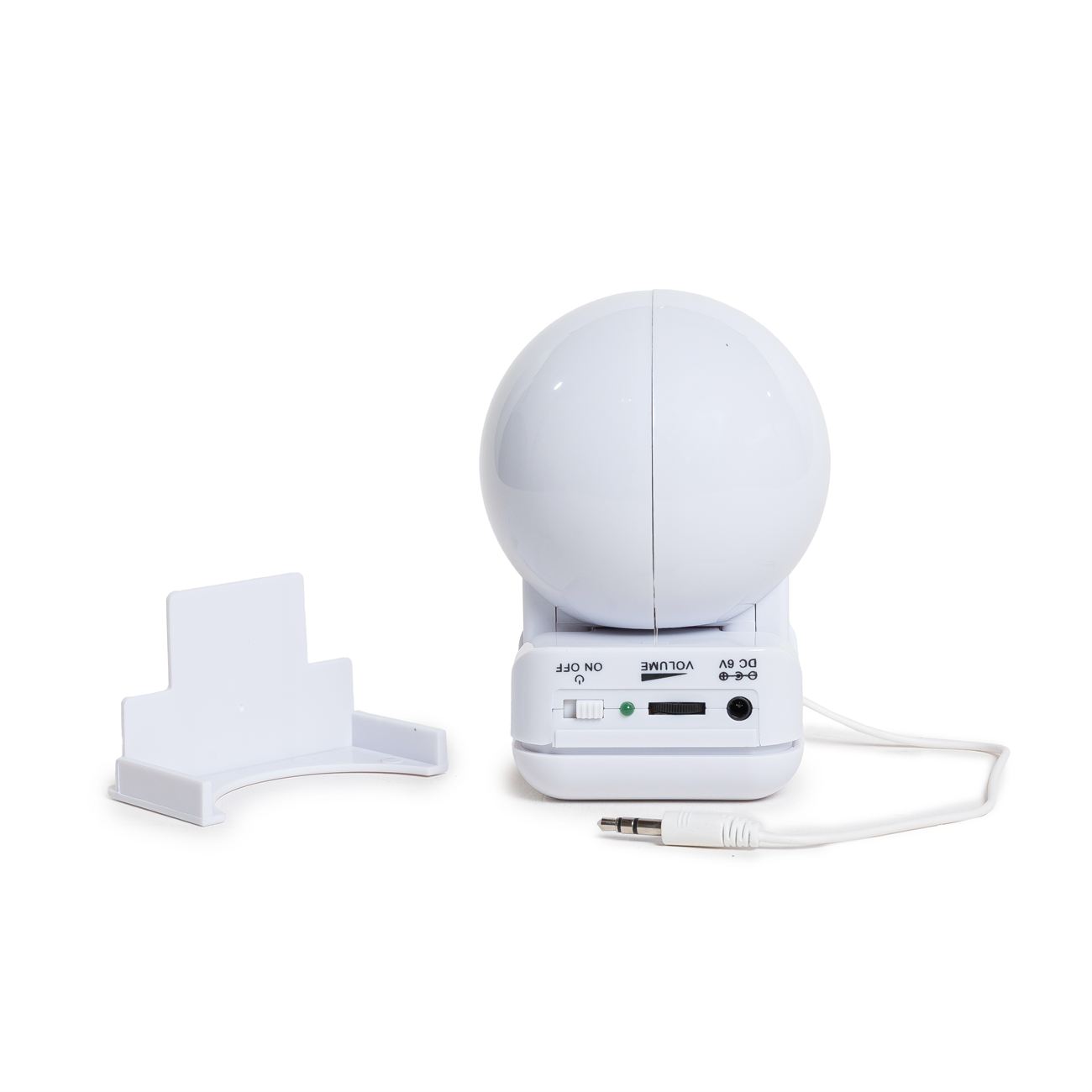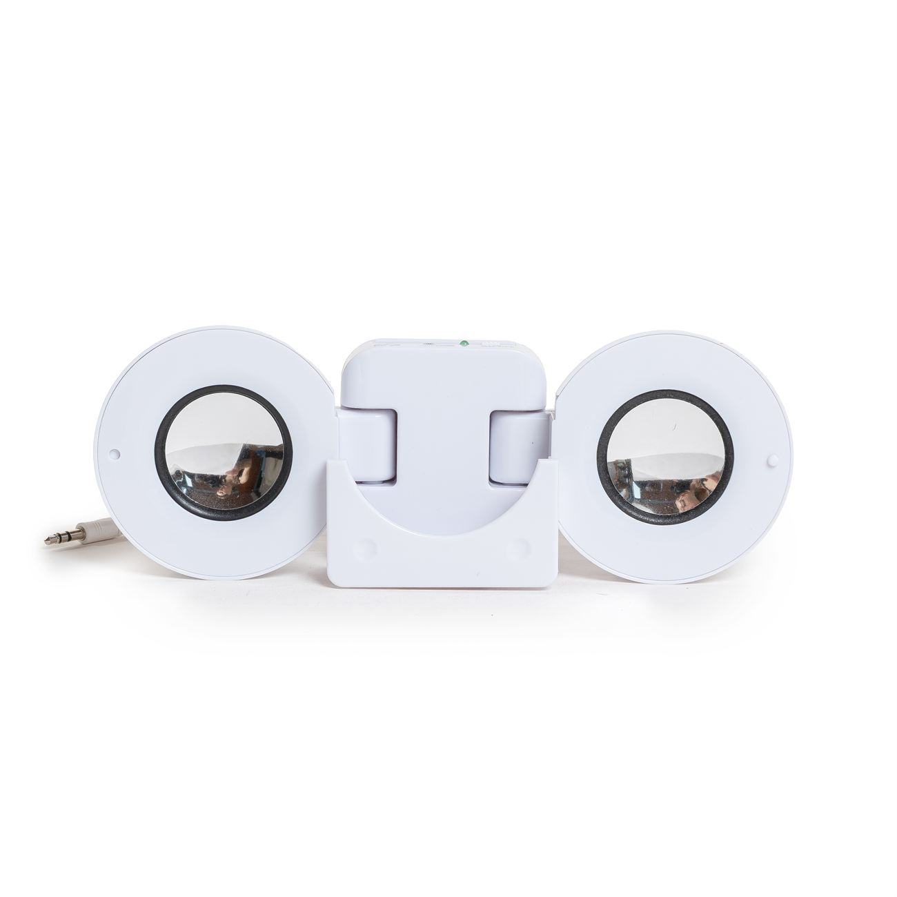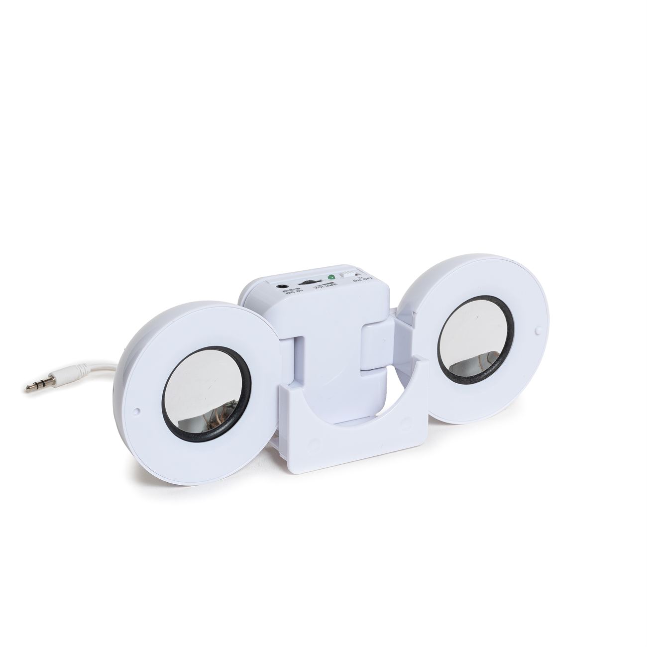 Speaker con parlante doble, botón de encendido y regulador de volumen, cable conector con ficha stereo iniplug jack de 3.5cm. el sistema de alimentación requiere 4 pilas AAA o también por cable USB que proviene en el kit.
