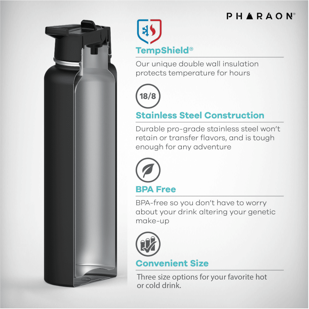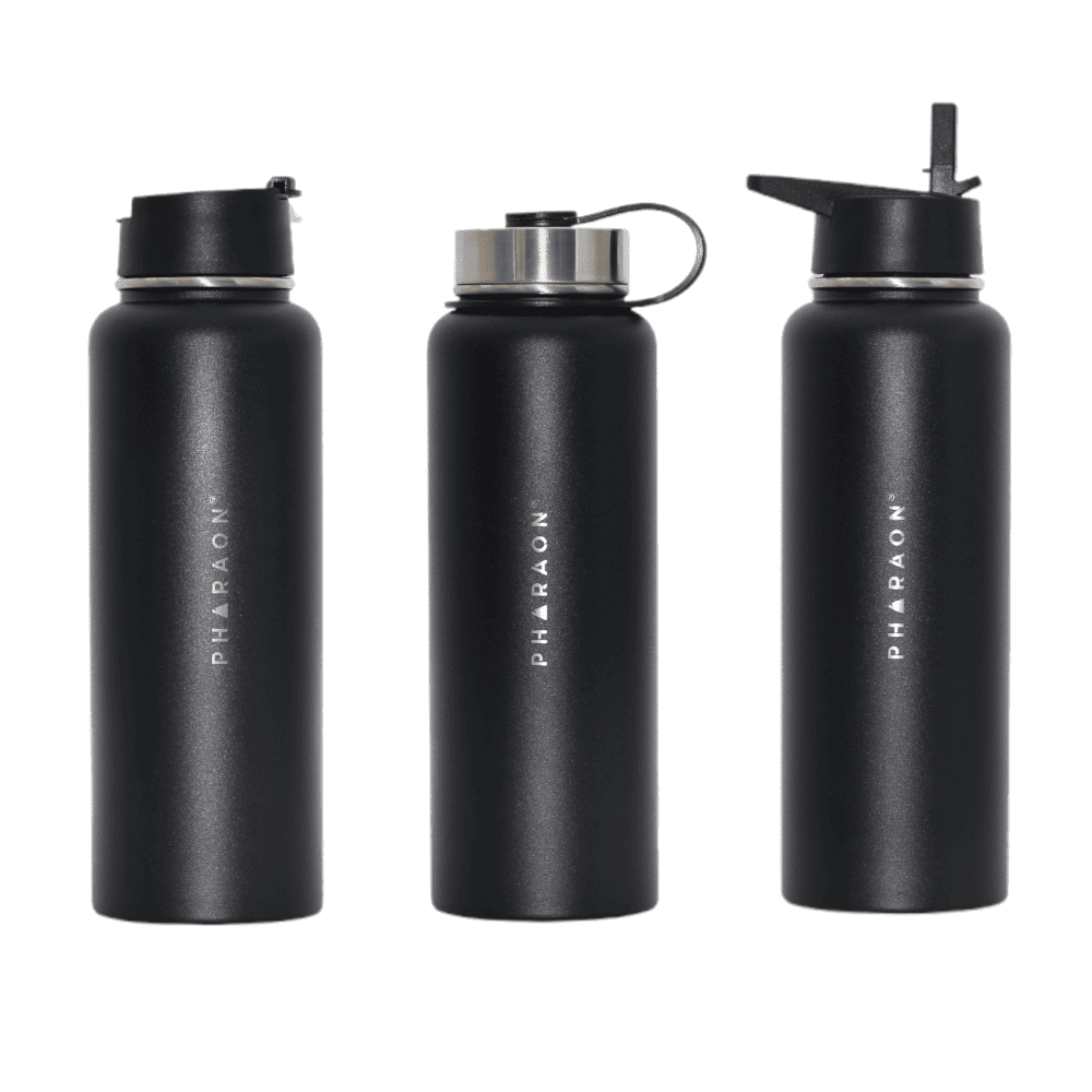 Acero inoxidable con aislamiento al vacío. Doble pared. Sin BPA. A prueba de fugas. Apta para viajes. Incluye 3 tapas. Apto para bebidas frías y calientes.