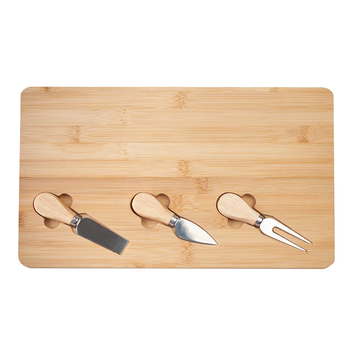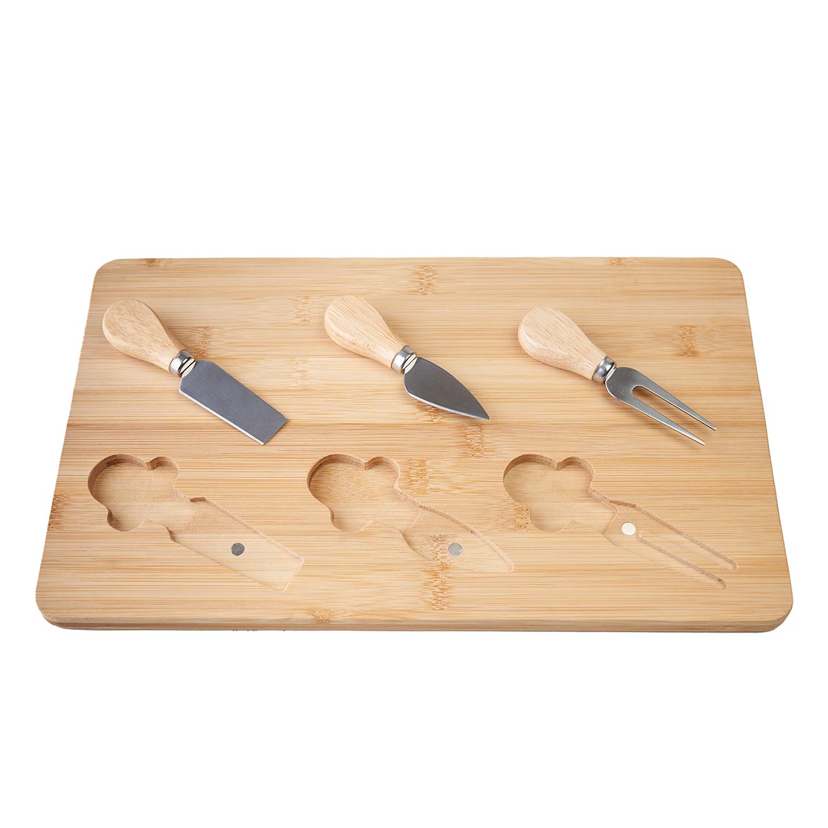 Tabla para picadas de quesos, elaborada en bamboo, con espacio imantado para organizar los utensilios. Incluye cubiertos de acero inoxidable con mango en bamboo: espátula, cuchillo y tenedor. Producto aprobado por el I.N.A.L. para el contacto con alimentos. Medidas: 43 x 24 x 1,5 cm. Laguiole.