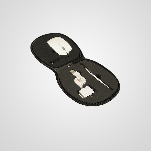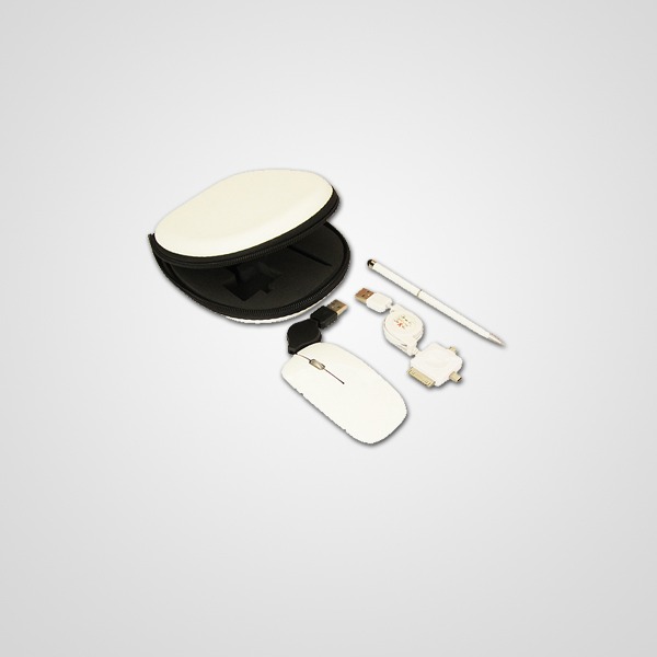 Descripción: Set de PC compuesto por Mouse óptico, bolígrafo metal con I-touch y un conector USB múltiple estuche contenedor de PVC blanco.