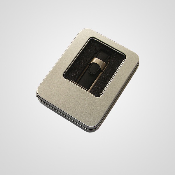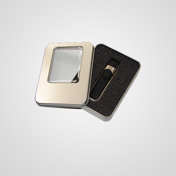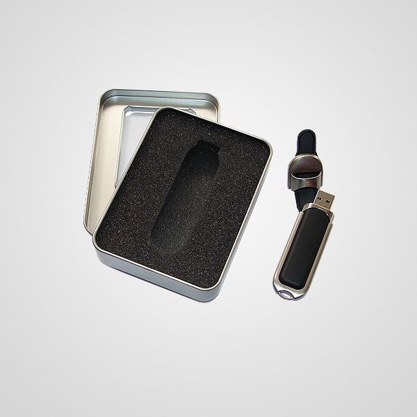 Descripción: Pendrive de 16GB en cuero con laterales y tapa de metal y presilla de cuero, caja contenedora metálica con visor traslucido con cobertura de cartón.