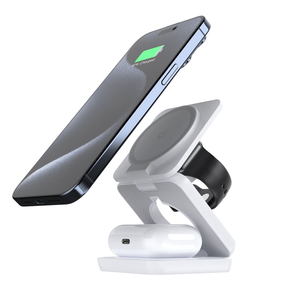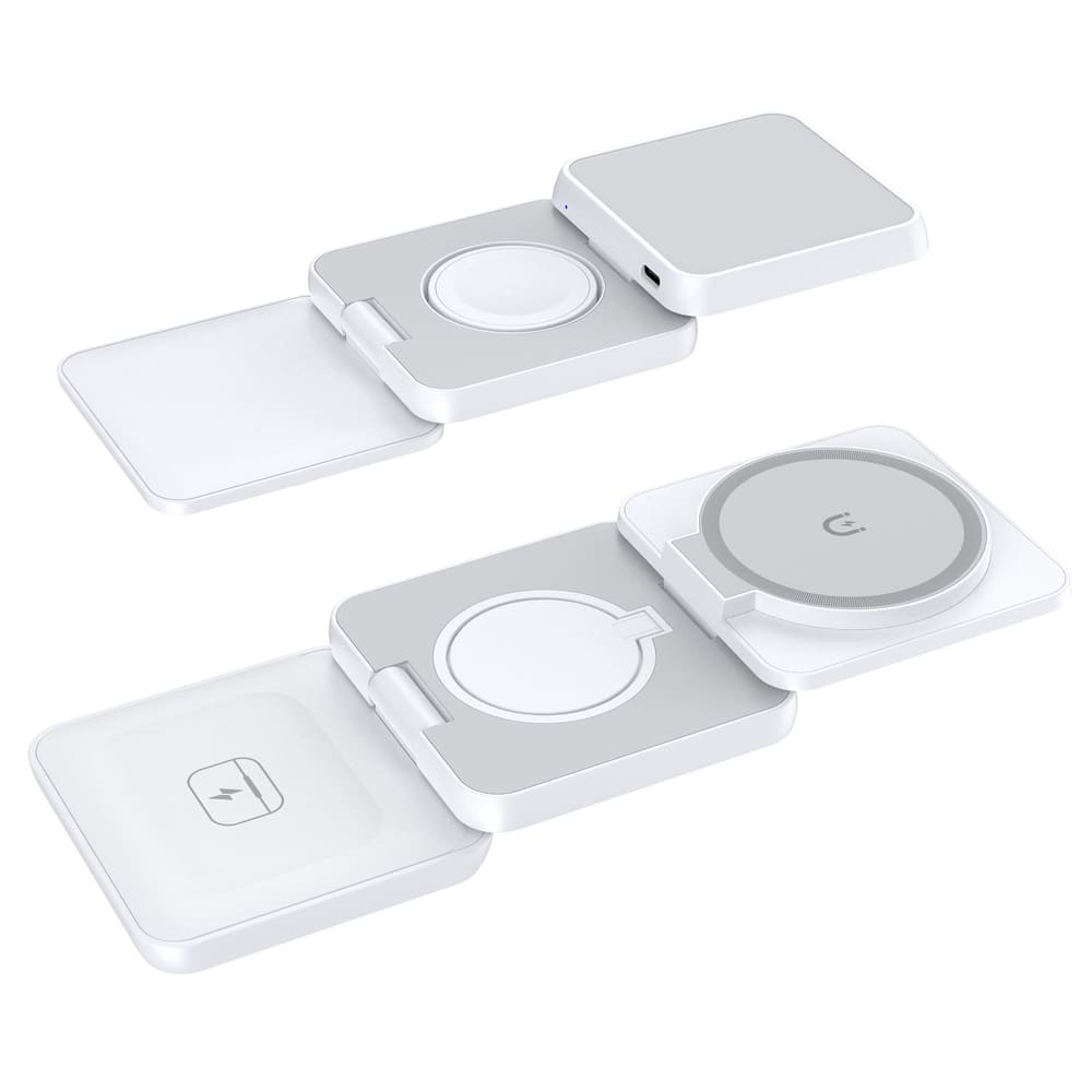 El Cargador Magnético Plegable 3 en 1 es un dispositivo elegante y altamente funcional que te permitirá cargar tus dispositivos de manera rápida y eficiente. Su diseño ultrafino lo hace fácilmente transportable, sin tener que preocuparte por el espacio que ocupa. Cuenta con tres puertos que te permiten cargar varios dispositivos simultáneamente, lo que significa que no tendrás que esperar a que un dispositivo se cargue antes de poder cargar otro. Con este cargador magnético 3 en 1, tendrás la flexibilidad de cargar cualquier dispositivo, ya sea un teléfono móvil, un Iwatch o los airpods. Provee cable conector USB a USB-C. Provee caja contenedora de cartón blanca e instrucciones.